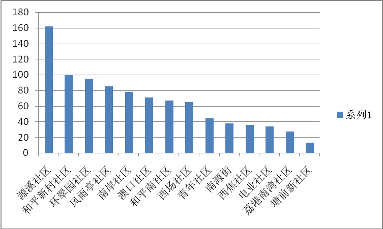 全街道残障人士分布情况如上图,其中源溪社区的残障人士最多,超过160人。其次为和平新村社区106人,占南源街残障人数的11.4%。和平新村处于距离南源街家庭综合服务中心较远,处于服务策略的第三阶梯,是南源街家庭综合服务中心第三年度的重点覆盖的社区。