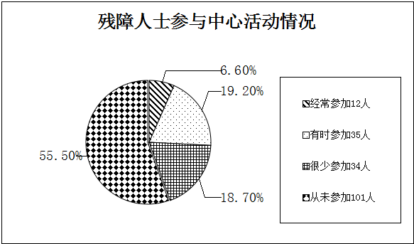 在调查的残障人士中值得关注的是,尚有55.5%的服务对象从未参与过中心活动(见图4)。其中处于第二三阶梯的西场、和平新村、和平南等社区占较大比例,需要在新一年服务中逐步覆盖。